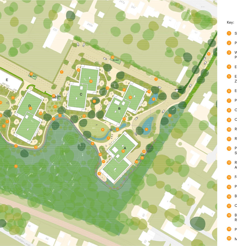 The layout preserves and enhances the ecological protection area in the southern part of the site and delivers several benefits for our neighbours over the consented plans, with buildings located further away from boundaries and their orientation altered to open more views across the site.